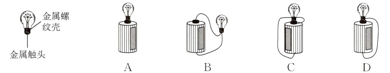 D 解析:选项A中金属螺纹壳没有和电源的负极连接起来,没有形成电路,A错误;选项B中电池的正、负极均连在了小灯泡底端的金属触头上,电源被短路,B错误;选项C中电池的正、负极连在了一起,电源被短路,C错误;选项D中金属触头接在了电池正极上,金属螺纹壳连在了电池负极上,电路是通路,D正确.
