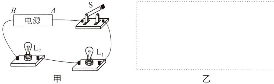 (2)连接完电路后闭合开关S,灯泡$L_1$和$L_2$均发光,此时电路中的电流从$L_1$流到$L_2,$则电源的正极在______(选填“A”或“B”)端.在图乙虚线框中画出对应的电路图.