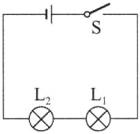 (3)将开关S断开,然后把灯泡$L_{2}$两端的接线柱用一根导线相连接,小明再次闭合开关S,该导线将灯泡$L_{2}$短路,灯泡$L_{2}$不发光.