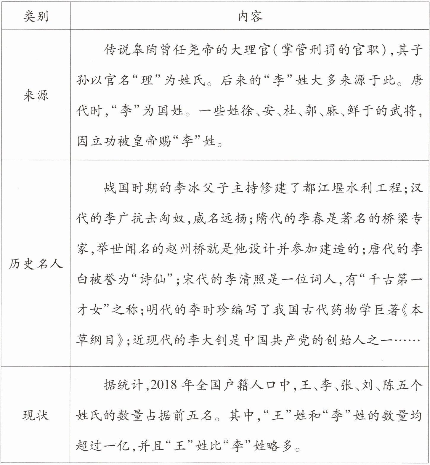 2. 关于“李”姓历史名人的问题,从“隋代的李春是著名的桥梁专家,举世闻名的赵州桥就是他设计并参加建造的;唐代的李白被誉为‘诗仙’”这句话中能直接找到答案。