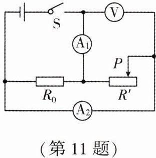 11. 如图所示的电路中,电源电压恒定.R₀是定值电阻,闭合开关S,向右移动滑动变阻器滑片P的过程中,三个电表示数的变化情况为:电流表$A_1$的示数