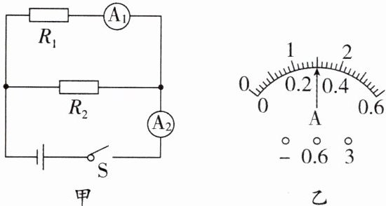 10. 图甲所示电路的电源电压为3 V,闭合开关S后,两电流表的指针偏转均如图乙所示,则电路的总电阻为