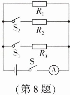 8. 如图所示电路,电源电压恒定$,R_1、$$R_2、$$R_3$均为定值电阻.当开关S闭合$,S_1、$$S_2$断开时,电流表A的示数为0.2 A;当开关S、$S_1$闭合$,S_2$断开时,电流表A的示数为0.4 A;当开关S、$S_1、$$S_2$都闭合时,电流表A的示数为0.5 A,则(
