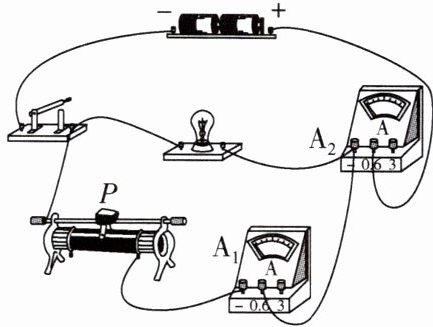 7. (2024·济南中考)某学习小组连接了如图所示的实物电路,闭合开关,移动滑片P的过程中,关于电流表$A_1$的示数$I_1、$电流表$A_2$的示数$I_2$以及灯泡的亮度,可能出现的现象是(