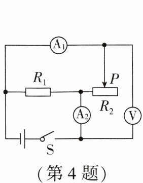 4. (2024·大庆中考)如图所示的电路中,电源电压恒定.闭合开关 S 后,滑动变阻器的滑片 P 向右移动的过程中,下列说法正确的是 (