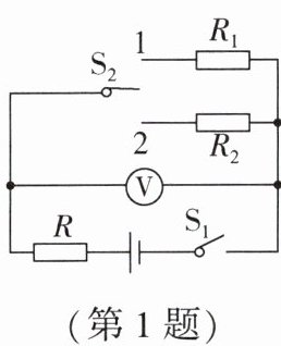 1. 如图所示的电路中,已知定值电阻 $ R_{1}= 5\ \Omega $,$ R_{2}= 4\ \Omega $.当开关 $ S_{2} $ 接到位置 1、闭合 $ S_{1} $ 时,电压表的示数为 1.0 V;当开关 $ S_{2} $ 接到位置 2、闭合 $ S_{1} $ 时,则电压表的示数可能为 (