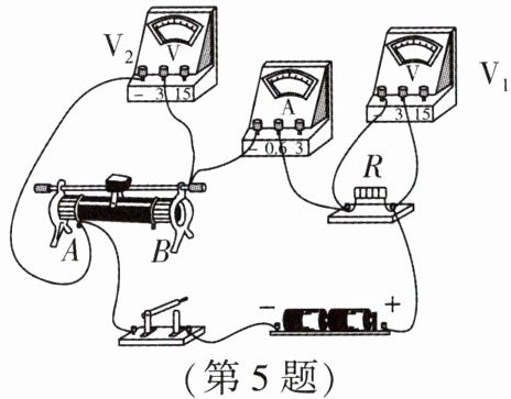 5. (2024·安徽中考)如图所示的电路中,电源两端电压保持不变,R 为定值电阻.闭合开关,在保证电路元件安全的前提下,将滑动变阻器的滑片由 B 端滑到 A 端,电压表 $ V_{1} $、电压表 $ V_{2} $、电流表 A 的示数变化量的绝对值分别为 $ \Delta U_{1} $、$ \Delta U_{2} $、$ \Delta I $,则 (