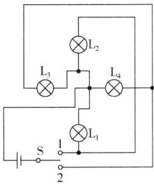 2. 如图是简易手动交通信号灯模拟电路的一部分,请补画一根导线,使开关S接1时,只有$L_1、$$L_2$亮,开关接2时,只有$L_3、$$L_4$亮.