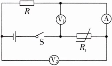 7. (2024·福建中考)如图所示电路,电源电压保持不变,R 为定值电阻,$R_{t}$为热敏电阻,其阻值随温度的降低而增大.闭合开关 S,当热敏电阻$R_{t}$的温度降低时,电压表$V_{1}$的示数
