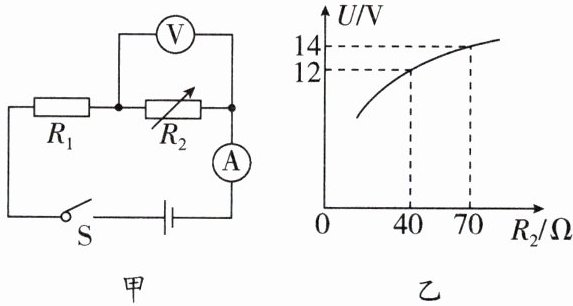4. (2025·南京树人学校月考)如图甲所示的电路中,电源两端的电压保持不变,电流表的量程为0~0.6A,电压表的量程为0~15V,可变电阻$R_{2}$的铭牌上标有"200Ω 1A"的字样.闭合开关 S,在调节可变电阻$R_{2}$阻值的过程中,电压表的示数 U 与$R_{2}$接入电路阻值的关系如图乙所示.若要求两只电表的示数均不能超过所选量程,下列说法正确的是 (