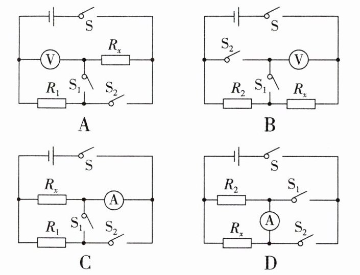 3. 核心素养 科学思维 为测出未知电阻$R_{x}$的阻值(约600Ω),小红选用电压小于3V的稳压电源、$R_{1}= 500Ω与R_{2}= 10Ω$的定值电阻、量程为0~3V的实验室电压表、量程为0~0.6A的实验室电流表等元件,设计了下面四个测量电路,其中可行的是 (