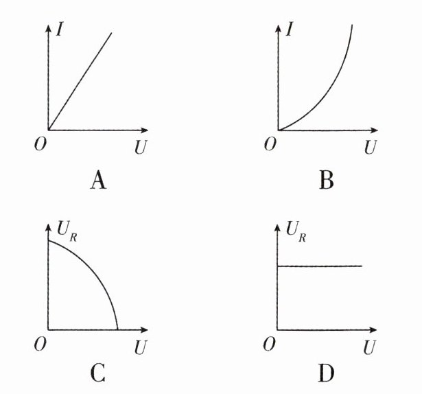 1. (2024·南通如皋市期中)如图所示,电路中的 M 为电子集成元件,其两端所加的电压与其电阻的比值为定值,R 为定值电阻,电源电压可调.现闭合开关 S,则通过 M 的电流 I、定值电阻两端的电压$U_{R}$与电源电压 U 的关系图线可能正确的是 (