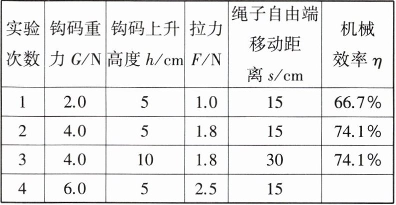 |实验次数|钩码重力G/N|钩码上升高度h/cm|拉力F/N|绳子自由端移动距离s/cm|机械效率η|