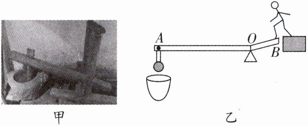 5. (2024·泰州姜堰区二模)研学实践活动时,小明在农家乐看到一种农具(如图甲),他查阅资料后知道,这种农具叫"舂",是农民捣谷用的,其工作原理图如图乙,AOB 为碓杆,O 为支点,A 处连接着碓头,脚踏碓杆的 B 处可使碓头升高,抬起脚,碓头会落下去击打稻谷,若碓头的重力为 40 N,每踩一次碓头上升的高度为 60 cm,AO 长 1.6 m,OB 长 0.4 m.