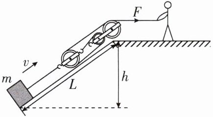 6. 如图所示,某建筑工地上,工人通过固定在斜面顶端的滑轮组把工件匀速拉上斜面.已知斜面高 h= 6 m,长 L= 10 m,工人施加的拉力 F= 600 N,工件的质量 m= 250 kg,工件沿斜面上升的速度 v= 0.5 m/s;若不计工件和滑轮组长度,忽略绳和动滑轮质量及绳与滑轮间、滑轮与轮轴间的摩擦,g 取10 N/kg.求: