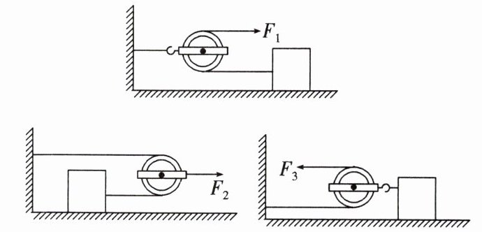 C 解析:不计滑轮与轴及轻绳间的摩擦,假设物体与地面的摩擦力为f,由于第一个图中滑轮为定滑轮,使用过程不省力,故$F_{1}=f$;第二个图中滑轮为动滑轮,但$F_{2}$作用在动滑轮上,费2倍的力,所以$F_{2}=2f$;第三个图中滑轮为动滑轮,省一半的力,则$F_{3}=\frac{1}{2}f$,故$F_{2}>F_{1}>F_{3}$,故C正确.