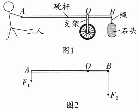 3. 图1中工人用工具搬运石头,该工具可简化成图2中杠杆AB,移动支架,可使支点O在AB间移动.杆水平静止,忽略杆重.