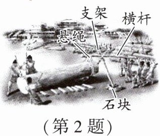 2. 新素材传统文化 如图为我国古人运送巨木的劳动情境示意图,他们通过横杆、支架、石块等,将巨木的一端抬起.当巨木太重无法抬起时,下列改进方法可行的是(