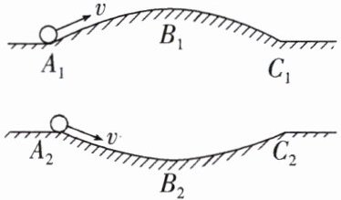 6. 核心素养 物理观念 如图所示,两个相同的光滑弧形槽,一个为$A_1B_1C_1$凸形,一个为$A_2B_2C_2$凹形,两个相同小球进入两弧形槽的速度都为v,运动到槽的末端速度也都为v,小球通过凸形槽的时间为$t_1,$通过凹形槽的时间为$t_2,$则$t_1、$$t_2$的关系为 (