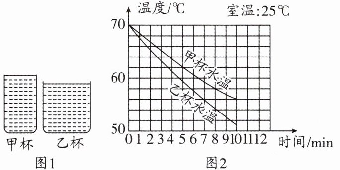 11. 新趋势 开放性设问 小明想了解热水在图1的哪个杯子中降温更快,他往两杯子中倒入等质量热水同时开始计时,测得水温随时间变化的图像如图2.