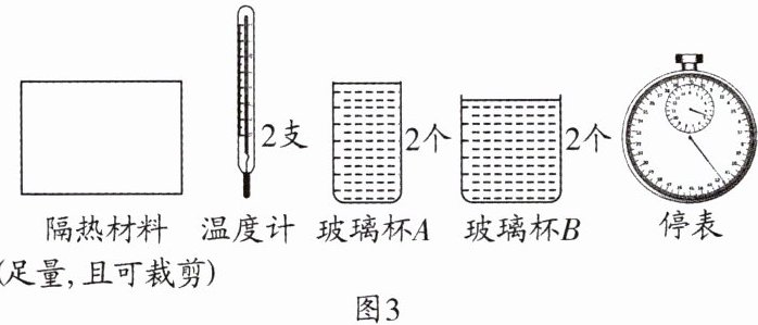.(3)是什么因素造成了两杯热水降温快慢的不同?小明猜想可能是两个杯子开口散热面积的不同和杯身散热的不同.请设计实验探究热水降温快慢与玻璃杯开口大小是否有关,写出实验步骤(已提供足量热水,从图3中自选器材).