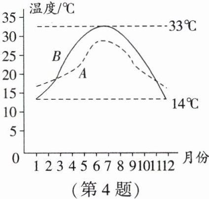 4. (2024·宿迁宿豫区期中)如图是某一内陆城市与某一沿海城市年气温变化曲线。从图像可以看出,在一年中,曲线B所示的城市气温变化较