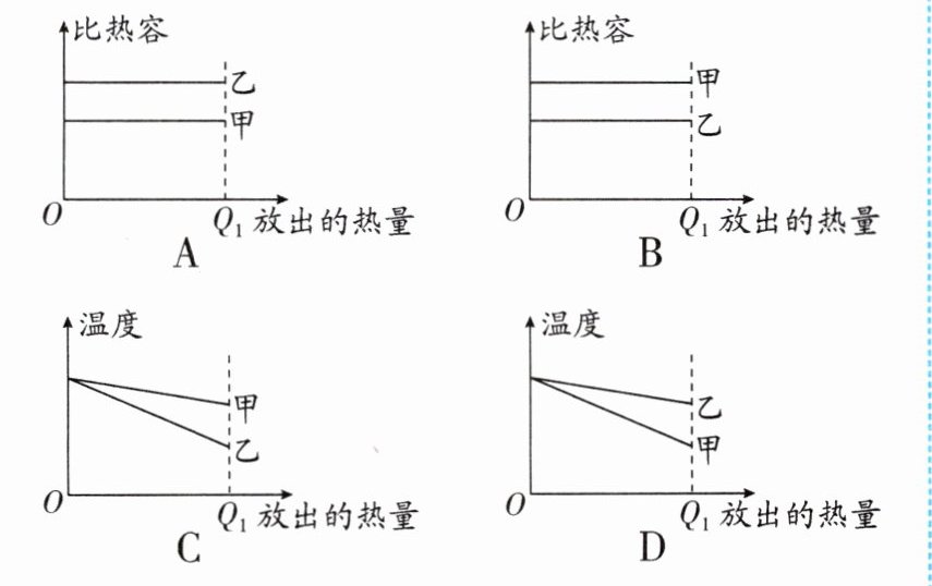 D 解析:根据题意可知,甲、乙的初温相同,吸收相同热量后,甲的末温比乙的高,这说明甲的温度变化较大;则初温相同的甲、乙,放出相同的热量后,甲的温度变化大,所以甲的末温低;由于不知道甲、乙的质量大小关系,根据$c=\frac{Q}{m\Delta t}$可知,无法判定甲、乙比热容的大小,故D符合题意.