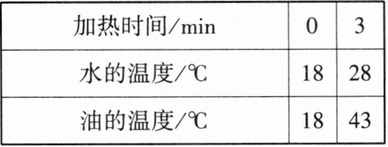 $10. $两只相同的电加热器$,$分别给相同体积的水和某种油加热。在开始时和加热$3 min$时各记录一次温度。如表所示$,$已知$\rho_{\text{油}}= 0.8× 10^{3}\text{kg}/\text{m}^{3},$水的比热容为$4.2× 10^{3}J/(kg·℃),$加热效率为$90\%,$油的末温没有达到它的沸点。下列说法正确的是$($