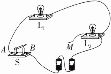 A L₁ 断路 解析:当导线M端接到图中A点时,开关S位于干路上,同时控制两盏灯;当导线M端接到图中B点时,开关S位于灯泡L₁所在支路上,只控制该支路,不能控制L₂所在的支路.并联电路中,如果一条支路短路,则电源被短路,两灯均不亮,所以是发生了断路.L₁熄灭,L₂正常,则说明是L₁断路.