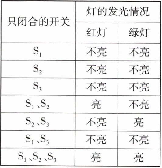 解析:由表格分析可知:①单独闭合S₁或S₂或S₃,灯都不亮,说明每个灯至少需要同时闭合两个或两个以上的开关,才可以正常工作.②当闭合开关S₁、S₂或S₂、S₃时,只有一个灯亮,闭合开关S₁、S₃时灯不亮,说明两灯并联,且S₂是干路开关,S₁、S₃分别控制一个灯.③当闭合S₁、S₂时,红灯亮,说明S₁控制的是红灯;当闭合S₂、S₃时,绿灯亮,说明S₃控制的是绿灯;综合上述情况,可以判断出:两灯并联,且开关S₂在干路,S₁、红灯在同一支路,S₃、绿灯在同一支路.