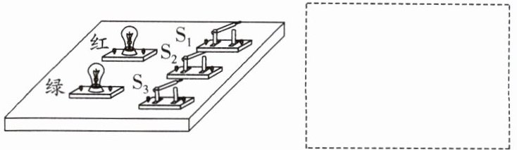 10. 设计电路:如图所示的电路盒,面板上有红灯、绿灯各一个,三个拨动开关$S_1、$$S_2、$$S_3,$为了在不打开盒子的情况下探究盒内的电路结构,小明做了多次实验并将结果填入下表.画出该盒内的电路图.