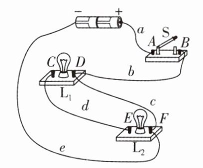 (3)小刚想将电路全部拆散,重新连接.小强认为只需拆除c这一根导线,就能成为两灯______(填"串联"或"并联")的正确电路.小强将多余的c导线拆除以后,闭合开关S时,小电灯$L_1、$$L_2$都不亮.用一段导线的两端接触A、B两点时,两灯都不亮;接触C、D两点时,两灯也不亮;接触E、F两点时,只有灯$L_1$亮.对此,下列判断中正确的是______.