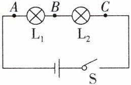 (3)连接好电路后闭合开关S,若小慧发现$L_1、$$L_2$两只灯泡都不亮,她用一根导线接在A、B两点,两灯仍不亮,又将导线拆下连接在B、C两点,发现$L_1$亮了,则故障是
