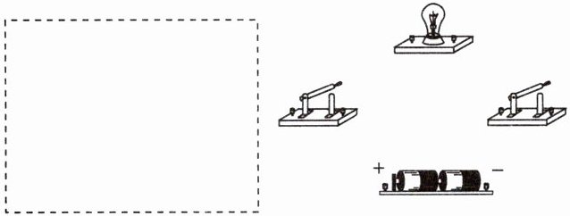 4. 在校园歌手初赛环节中,歌手需要同时获得两位评委的通过(按下开关)就能成功进入复赛(亮灯).请你设计一个电路,只有两个开关同时闭合时灯亮.请你在虚线框中设计电路,并将实物元件连成电路.
