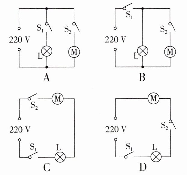 1. (2024·无锡中考)电冰箱冷藏室中的照明灯L由门控开关$S_1$控制,压缩机(电动机)由温控开关$S_2$控制,要求照明灯和压缩机既能单独工作又能同时工作,下列电路中符合上述特点的是(