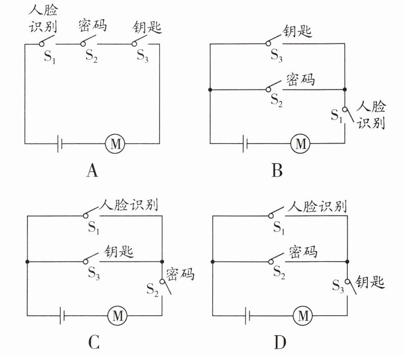 6. (2024·湖南中考)科技小组模拟"智能开锁"设计的电路图,有两种开锁方式,即"人脸识别"与输入"密码"匹配成功,或"人脸识别"与使用"钥匙"匹配成功才可开锁.现用$S_1$表示人脸识别$,S_2、$$S_3$分别表示密码、钥匙.匹配成功后对应开关自动闭合,电动机才工作开锁.满足上述两种方式都能开锁的电路是(