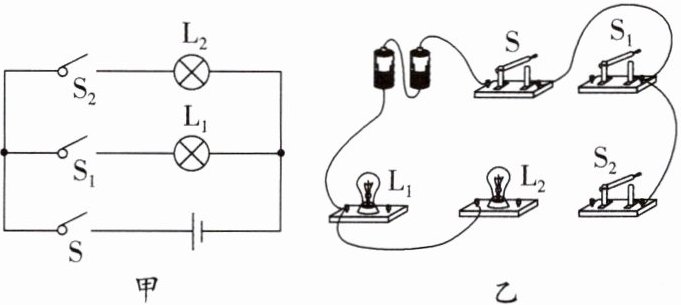 (1)由图甲可知,两灯泡并联,开关S在干路上,开关S₁和灯L₁串联在一条支路中,开关S₂和灯L₂串联在另一条支路中,如图所示: