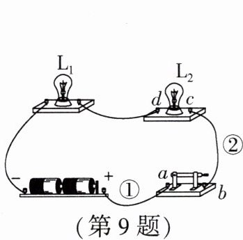 9. (2024·盐城盐都区一模)在如图所示的电路中,闭合开关,两灯泡都不发光.为了寻找灯泡不亮的原因,用导线将电压表的正接线柱固定在电源正极,电压表负接线柱上的导线依次接触a、b、c、d四个接线柱,发现与a、b接线柱接触时电压表无示数,与c、d接线柱接触时电压表有示数.若电路中只有一处断路,位置可能是 (