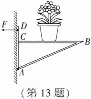 13. 如图所示,放置花盆的支架只在A、D两点用螺钉固定在墙壁上,BC保持水平。已知AC长为$l_1,CD$长为$l_2,BC$长为$l_3,$花盆的重力为G,重力作用线恰好过BC中点。若不计支架的重力,则D点螺钉对支架的水平拉力F= (用已知量表示)。为了减小拉力F,花盆位置应离墙壁 一些。