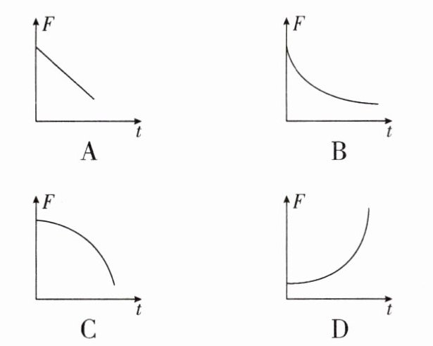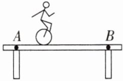 A 解析:重为 G、长为 L 的水平独木桥的两端由两根竖直支柱 A、B 支撑着,分别对水平独木桥的支持力为$F_{A}$、$F_{B}$,水平独木桥受到重力为 G,独轮车对独木桥的压力为$F=(m + M)g$.以 B 为支点,独轮车对独木桥的压力的力臂为$L - vt$,根据杠杆平衡条件:$F_{A}L = G×\frac {1}{2}L + (m + M)g(L - vt)$,$F_{A}=\frac {1}{2}G + (m + M)g - \frac {1}{L}(m + M)gvt$,A 柱所受压力与 A 柱对小车的支持力是一对相互作用力,所以 A 端支柱所受压力$F = F_{A}=\frac {1}{2}G + (m + M)g - \frac {1}{L}(m + M)gvt$,由此可知 A 端支柱所受压力 F 与时间 t 是一次函数图像(不经过原点).故选 A.