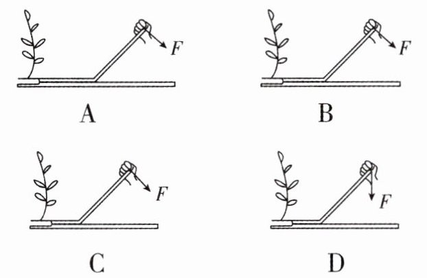 9. 新趋势 跨学科实践 为了拔除外来入侵物种“一枝黄花”,农业专家自制轻质拔草器,如图所示,将拔草器左下端的叉子插入植株根部,用手对拔草器施力,可将植株连根拔起。若拔同一植株,手施力最小的是 (
