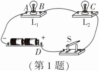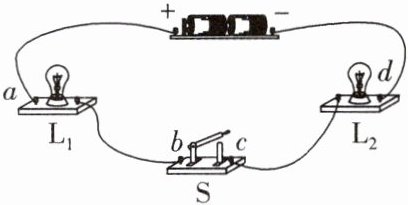 3. (2024·无锡江阴市期中)如图所示为小明连接的电路,他检查导线连接无误后,闭合开关S,发现两灯均不发光,于是他用一根导线分别连接到ab、bc、cd和ac两点,灯$L_1、$$L_2$均不发光,再用导线连接到bd两点时,灯$L_1$发光$,L_2$不发光,由此判定电路的故障可能是(