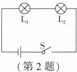 2. 小红同学将相同的两只小灯泡$L_1$和$L_2$串联在电路中,如图所示,接通开关后发现灯泡$L_1、$$L_2$都不亮;当她用另一只相同规格的完好灯泡$L_3$并联在$L_1$两端时,发现三灯都不亮;当把$L_3$并联在$L_2$两端时,发现只有灯$L_3$亮了.产生这一现象的原因分析,你认为合理的是(