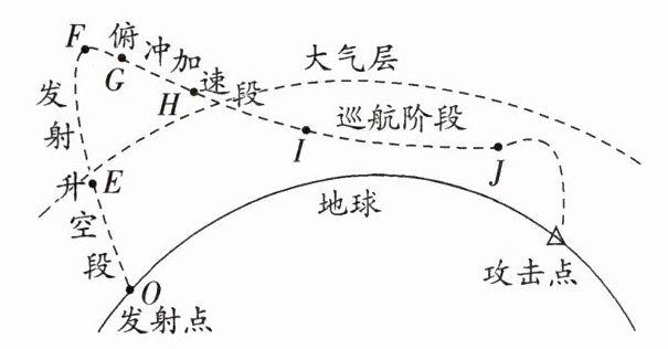 5. 新素材科学前沿 巡航导弹是导弹的一种,具有突防能力强、难以拦截的优点.图示为某巡航导弹的飞行路线图,发射升空段,发动机点火,导弹以极快的速度穿出大气层升至高空;俯冲加速段,发动机处于关闭状态,导弹向下俯冲,会被加速到极高的速度;巡航阶段,主发动机的推力与阻力平衡,弹翼的升力与重力平衡,可以实现远距离"巡航状态",最后精确打击目标.下列关于该巡航导弹的说法正确的是(