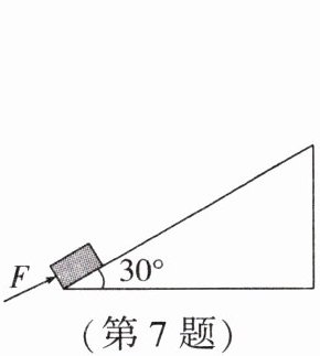 7. (2024·扬州广陵区期中)如图所示的固定斜面长5m,倾角为30°,木箱重150N.某同学用100N的推力F沿斜面向上推木箱,用10s的时间将木箱沿斜面匀速从底端推到顶端,下列说法正确的是(
