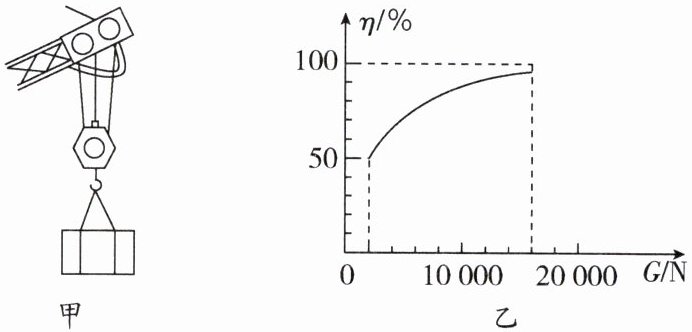 (2)由图甲可知,$ n=3 $,由图乙可知物体在16000 N时绳子断了,绳子能承受的最大拉力为$ F_{\text{大}}=\frac{1}{3}(G_1+G_{\text{动}})=\frac{1}{3}×(16000\ \text{N}+2000\ \text{N})=6000\ \text{N} $.
