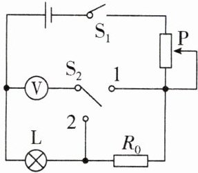 (1)闭合开关$ S_{1} $,将开关$ S_{2} $拨到触点2,此时$ R_{0} $、滑动变阻器和灯泡串联,电压表测灯泡电压,移动滑片,使电压表的示数为小灯泡的额定电压2.5V,灯泡正常发光.