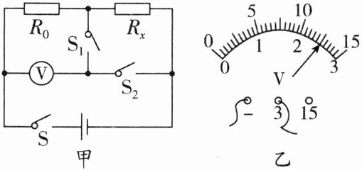 (1)①由题图甲可知,只闭合开关S、$ S_{1} $时,$ R_{0} $与$ R_{x} $串联,电压表测量$ R_{0} $两端的电压,即$ U_{0}=U_{1} $,根据串联电路电流规律可知$ I_{x}=I_{0}=\frac{U_{0}}{R_{0}}=\frac{U_{1}}{R_{0}} $;
