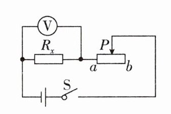 (2)闭合开关S,滑片P移到b端时,滑动变阻器与$ R_{x} $串联,且滑动变阻器接入电路中的阻值最大为$ R_{\text{max}} $,此时电压表测$ R_{x} $两端的电压,读出电压表示数为$ U_{x}=U_{2} $.则此时滑动变阻器两端的电压为$ U_{\text{滑}}=U'-U_{x}=U_{1}-U_{2} $,电路中的电流为$ I=\frac{U_{\text{滑}}}{R_{\text{max}}}=\frac{U_{1}-U_{2}}{R_{\text{max}}} $.
