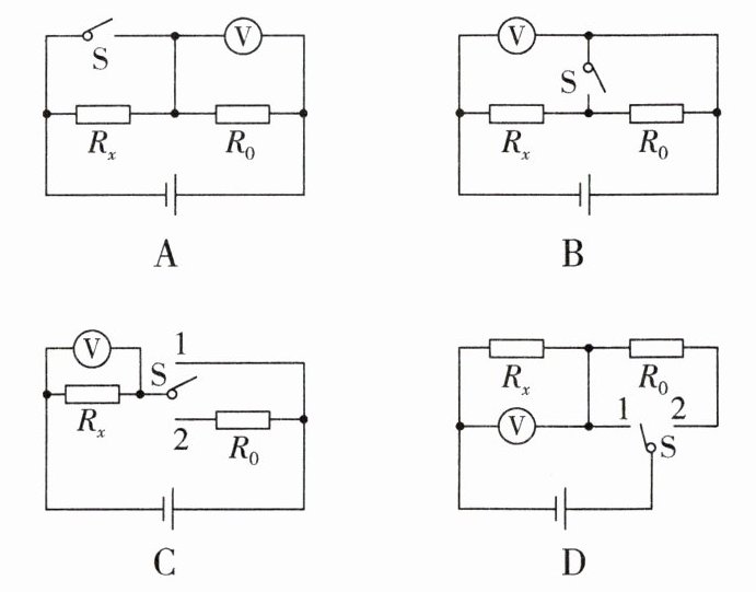 1. 以下设计的电路图中电源电压保持不变,某同学在没有电流表的情况下,利用电压表和阻值已知的定值电阻 $ R_{0} $ 来测量未知的定值电阻 $ R_{x} $ 的阻值,不能实现测量 $ R_{x} $ 阻值的是(